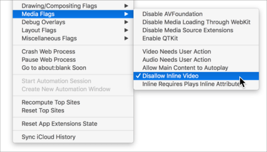 Anschließend kann man das Terminal wieder beenden und Safari neu starten. Hier findet man nun ein neues Menü namens Debug, in dem man anschließend im Untermenü "Media Flags" den Punkt "Disallow Inline Video" aktiviert. Dieser führt dazu, dass künftig keine Videos mehr ungefragt gestartet werden.