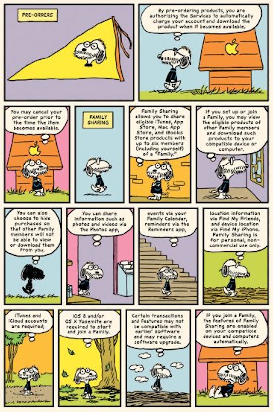 Inhaltlich entspricht der Comic Wort für Wort den aktuellen iTunes-Nutzungsverinbarungen. Sollte man sie sich bislang also nicht durchgelesen haben, bekommt man hier eine unterhaltsame und liebevoll aufbereitete Gelegenheit dazu. Auf jeder Seite trifft man dabei auf jede Menge bekannte Comic-Charaktere wie Snoopy, Garfield oder Wonderwoman. Ebenfalls auf jeder Seite mit dabei ist auch Steve Jobs, komplett mit Jeans und mit schwarzem Rollkragenpullover.
