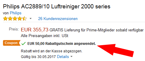 Derzeit lässt sich der Philips AC2889/10 Luftreiniger dank eines Rabattcoupons noch einmal um € 50,- reduziert bei Amazon bestellen und kostet somit über den folgenden Link nur noch € 305,72: Philips AC2889/10 Luftreiniger. Die angegebene Lieferzeit sollte einen dabei nicht abschrecken. Mein Gerät wurde trotz derselben Anzeige bereits nach vier Tagen verschickt.
