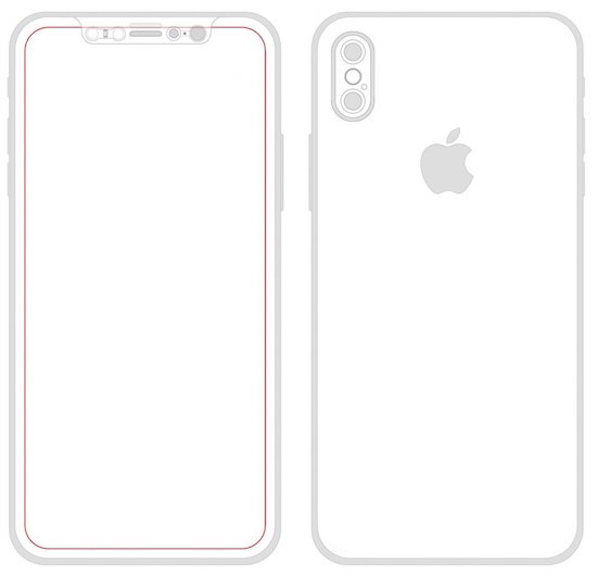 Aus derselben Quelle entstammt zudem eine neue Designskizze, auf der die einzelnen Komponenten noch einmal deutlicher zu erkennen sind. Neben dem Ohrhörer befinden sich darauf eine Reihe von Sensoren und die Frontkamera. Der rote Rahmen soll die eigentliche Displayfläche und damit auch den extrem schmalen Rand um dieses herum darstellen. Auf der Rückseite befindet sich der LED-Blitz nun zwischen den beiden Kameraobjektiven und wird vom Mikrofon zur Geräuschunterdrückung an selber Stelle ergänzt.