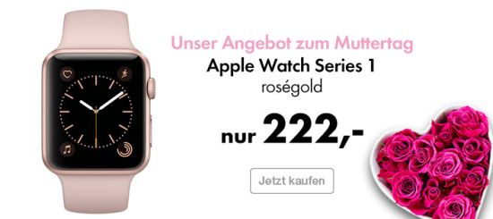 Bei EURONICS bekommt man unterdessen auch zum Muttertag mal wieder die Apple Watch Series 1 derzeit zum Sonderpreis. Konkret handelt es sich bei dem Muttertagsangebot passenderweise um ein Modell in roségold mit einem sandrosafarbenen Armband, welches man für nue € 222,- erwerben kann. Unter den Apple Watches bei EURONICS gibt es aber auch darüber hinaus verschiedene günstig angebotene Modellvarianten. Ein wenig stöbern lohnt also: