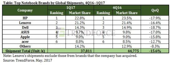 Während die im vergangenen Herbst vorgestellten MacBook Pros von vielen, vor allem professionellen Anwendern, nach wie vor kontrovers bewertet werden, scheint dies den Verkäufen keinen wirklichen Abbruch zu tun. Zumindest dann nicht, wenn man den aktuellen Zahlen der Marktforscher von TrendForce glaubt. Demnach konnte Apple im ersten Quartal 2017 3,4 Millionen MacBooks an den Mann bringen, was einem Anstieg von 15,4% im Vergleich zum Vorjahresquartal entspräche. Zwar gab es gleichzeitig einen Rückgang von 15,8% gegenüber dem vierten Quartal 2016, in dieses fällt jedoch das Weihnachtsgeschäft, welches traditionell für höhere Absätze sorgt. Der Anstieg im Jahresvergleich zeugt hingegen von einer starken Nachfrage nach Apples Notebooks. Hierdurch konnte Apple seinen Marktanteil auch auf einem gleichbleibenden Stand von 9% halten, während die Konkurrenten HP, Lenovo, Dell und Asus leichte Einbußen hinnehmen mussten.