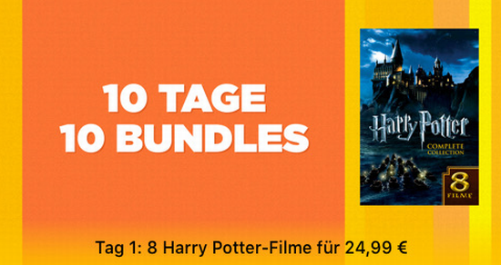 Traditionell kommen heute Nachmittag noch meine jeden Freitag veröffentlichten Tipps zu guten und günstigen Filmen im iTunes Store. Ab heute hat Apple zudem eine Sonderaktion im Programm, bei der in den kommenden 10 Tagen jeden Tag ein anderes Film-Bundle zum Sonderpreis angeboten wird. Den Anfang macht dabei heute das Harry Potter Bundle (€ 24,99 bei iTunes), bestehend aus allen acht Filmen der Reihe um den Zauberlehrling und seine Abenteuer in Hogwards. Selbstverständlich sind alle Filme in HD-Qualität und gehen nach dem Kauf für immer in euren Besitz über. Das Harry Potter Bundle kann heute zum Sonderpreis von nur € 24,99 über den folgenden Link aus dem iTunes Store geladen werden: Harry Potter Complete Collection