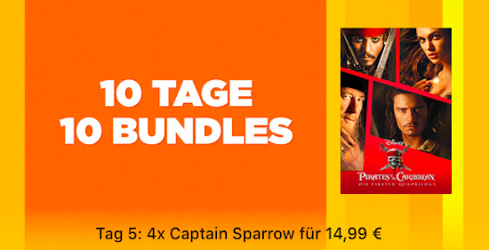Apple hat aktuell bekanntermaßen eine Sonderaktion im Programm, bei der an 10 Tagen jeden Tag ein anderes Film-Bundle zum Sonderpreis angeboten wird. Dabei kann man nur heute die Pirates of the Caribbean Quadrilogy (€ 14,99 bei iTunes), bestehend aus den bisherigen vier Filmen mit Johnny Depp als Captain Jack Sparrow, zum Sonderpreis über den iTunes Store beziehen. Würde man alle vier Filme einzeln kaufen, käme man auf einen Gesamtpreis von € 41,96. Selbstverständlich sind alle Filme in HD-Qualität und gehen nach dem Kauf für immer in euren Besitz über. Das Fluch der Karibik-Bundle kann heute zum Sonderpreis von nur € 14,99 über den folgenden Link aus dem iTunes Store geladen werden: Pirates of the Caribbean Quadrilogy