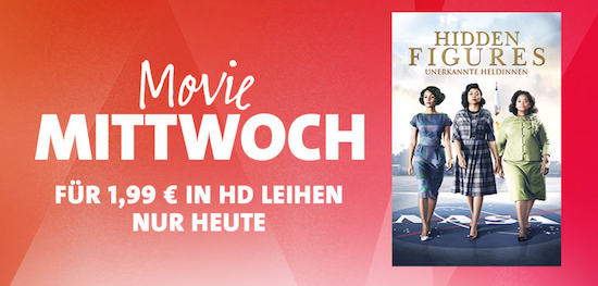 Auch heute hat Apple wieder den sogenannten "Movie Mittwoch" ausgerufen. Dabei wird jeden Mittwoch ein ausgewählter Film aus dem iTunes-Sortiment für 24 Stunden zum Sonderpreis von nur € 1,99 in HD-Qualität zum Leihen angeboten. Heute erhält man dabei das extrem eindrucksvolle Drama Hidden Figures über Frauen bei der NASA in den 60er Jahren. Nachdem man den Leih-Film geladen hat, kann er innerhalb von 30 Tagen angeschauen werden. Wie immer bei geliehenen Filmen aus dem iTunes Store gilt: Hat man hiermit einmal begonnen, muss man ihn innerhalb von 48 Stunden beenden.