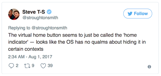 Neu könnte zudem eine Funktion namens "Tap to wake" sein, über die sich das iPhone-Display aufwecken lassen könnte, indem man doppelt auf das Display tippt, beispielsweise wenn das Telefon auf dem Tisch liegt. Unter anderem verfügten die Nokia Lumia Smartphones bereits über eine solche Funktion. Hierbei könnte es sich um eine Alternative zum Druck auf den Homebutton zu diesem Zweck handeln. Letzterer dürfte beim iPhone in seiner bisherigen Form fehlen und durch einen "Home Indicator" ersetzt werden, wie es in der Firmware heißt. Zudem wird bereits seit einiger Zeit über einen Funktionsbereich im unteren Teil des Displays spekuliert, der unter anderem den virtuellen Homebutton und andere Kontrollelemente enthält. Laut Troughton-Smith könnte diese aber beispielsweise für Apps ausgeblendet werden, die den gesamten Displaybereich beanspruchen. (via MacRumors)