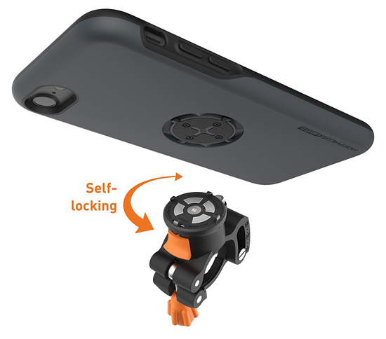 Quadlock bietet genau das selbe nur mit strammen und stabilen Gummiringen als Befestigung am Lenker. Daf\374r l\344sst das iPhone jederzeit in der Halterung drehen ohne es rausnehmen zu m\374ssen.