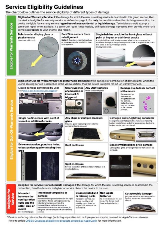 Zu den Fällen, die Apple als Garantiefall repariert, gehören unter anderem Verschmutzungen unter dem Displayglas, Pixelfehler, eine verrutschte FaceTime Kamera oder auch ein Haarriss im Displayglas. Kostenpflichtige Reparaturen außerhalb der Garantie führt Apple unter anderem für vom Nutzer gemeldete Wasserschäden, Korrosion, LCD-Risse, Displaybrüche durch Außeneinwirkung, defekte Lightning-, Audio- oder Mikrofon-Komponenten und ein verbogenes Gehäuse. Die Reparatur ablehnen sollen Apple-Mitarbeiter, falls der Nutzer Teile in Eigenregie ausgetauscht hat, die Beschädigungen mutwillig herbeigeführt hat oder auch nicht von Apple stammende Akkus eingebaut wurden. Ausschließlich kosmetische Beschädigungen wie Kratzer oder Dellen im Gehäuse werden ebenfalls generell nicht repariert.