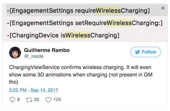 Nächstes Fundstück aus dem GM-Build von iOS 11. Entwickler Guilherme Rambo hat die ersten deutlichen Hinweise auf das zwar seit einiger Zeit schon gemunkelte aber bislang noch nicht bestätigte kabellose Laden beim iPhone X und evtl. auch bei den beiden anderen iPhones in den Tiefen des Codes entdeckt. So wird iOS 11 eine Routine mit der Bezeichnung "ChargingViewService" enthalten, über die bestimmt wird, ob ein Gerät auf dem die Software läuft kabelloses Laden unterstützt. Ist dem der Fall, werden auf dem Display verschiedene 3D-Animationen während des Ladevorgangs angezeigt. Angeblich soll die Technologie auf dem etablierten Qi-Standard basieren.