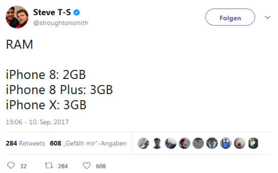 iPhone X und iPhone 8 Plus mit 3 GB, iPhone 8 mit 2 GB Arbeitsspeicher