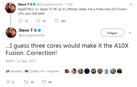 Auf dem Event am morgigen Abend darf neben den mit Spannung erwarteten neuen iPhones auch ein neues Apple TV erwartet werden, welches dann wohl erstmals Unterstützung für 4K-Inhalte mitbringt. Neueste Erkenntnisse aus der tvOS-Firmware deuten nun darauf hin, dass im Inneren der neuen Set-Top Box ein A10X Fusion Chip und 3GB Arbeitsspeicher zum Einsatz kommen. Diese Entdeckung machte Steve Troughton-Smith als er sich durch die Teifen des tvOS 11 GM-Builds wühlte, der am Wochenende ebenfalls ins Internet durchsickerte. Zum Vergleich: Die aktuelle Generation des Apple TV aus dem Jahr 2015 läuft mit einem A8-Chip und 2 GB Arbeitsspeicher. Die verbesserte Hardware im neuen Modell dürfte zweifelsohne den höheren Ansprüchen der 4K-Wiedergabe geschuldet sein. Profitieren könnten hiervon aber auch Spieleentwickler, die ihre Titel mit beeindruckenden Grafiken ausstatten könnten, die denen moderne Konsolen in nichts nachstehen. Auch Augmented Reality Funktionen wären hiermit zweifelsohne möglich.