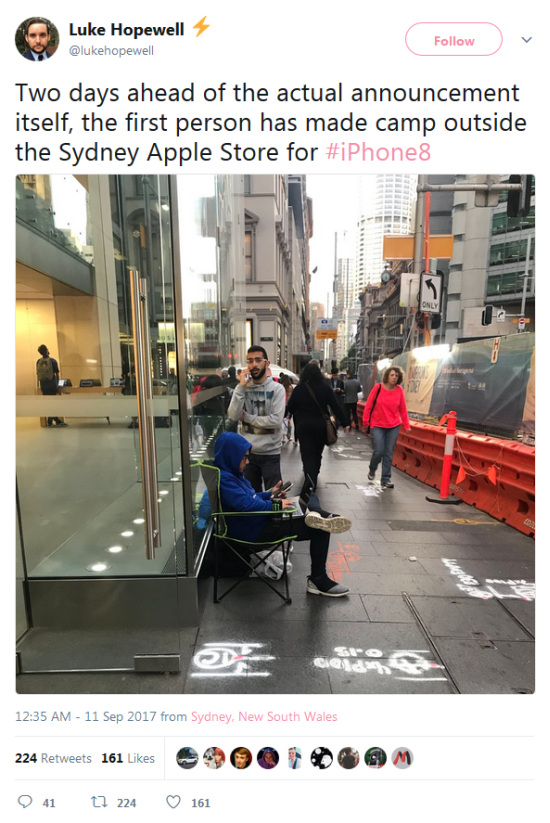 Indes hat sich tatsächlich bereits in Australien der erste Camper vor einem Apple Store in Sydney eingefunden, der auf den Verkaufsstart der neuen iPhones wartet. Wobei... Vielleicht steht er auch schon für 2018 an. Man weiß heutzutage ja nie.