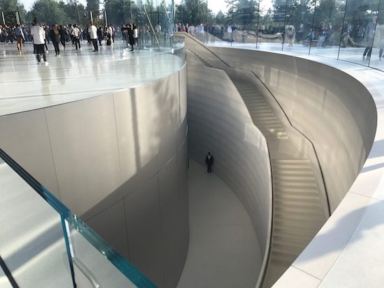 Die ersten Kollegen sind natürlich bereits vor Ort am Apple Park und inspizieren die Umgebung des neuen Apple-Hauptquartiers inkl. des Steve Jobs Theaters. Eine ausführliche Galerie haben beispielsweise die Kollegen von 9to5Mac zusammengestellt, aus dem auch das folgende Bild stammt.
