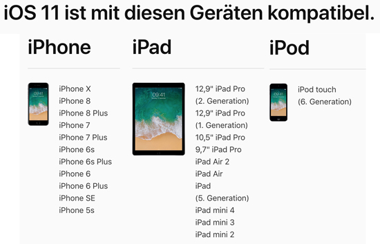 Am heutigen Abend endet die Beta-Phase von iOS 11 mit der allgemeinen Veröffentlichung des neuen Betriebssystems. Seit der WWDC haben die registrierten Entwickler und Teilnehmer am Public Beta Programm Apples neues Betriebssystem ausgiebig getestet und ihre Apps daran angepasst. Um 19:00 Uhr darf nun jeder Besitzer eines unterstützten iOS-Geräts die neue Version herunter laden. Womit wir schon beim ersten Thema wären. iOS 11 läuft auf allen iPhones ab dem iPhone 5s aufwärts, auf allen iPads ab dem iPad der 5. Generation aufwärts, auf allen iPad mini ab dem iPad mini 2 aufwärts, auf allen iPad Pros und auf dem aktuellen iPod touch der 6. Generation. Eine komplette Aufstellung gibt es unten. Allerdings sind nicht alle neuen Funktionen auf jeder Geräte-Generation verfügbar. Eine genaue Beschreibung liefert Apple auf seinen Infoseiten zu iOS 11. Zusätzlich zu den Hardware-Beschränkungen gibt es auch verschiedene regionale Beschränkungen bei den Funktionen. Diese werden von Apple auf einer eigenen Webseite gelistet, sollten in Mitteleuropa aber keine größeren Auswirkungen haben.