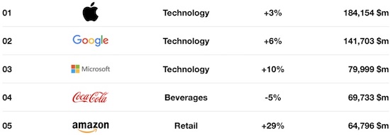 Apple zum fünften Mal in Folge zum wertvollsten Unternehmen der Welt gekürt