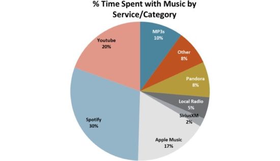 Ebenfalls auf einem guten Weg befindet sich nach wie vor Apple Music. So konnte sich der Streamingdienst mit 17% Marktanteil auf Platz drei hinter Spotify (30%) und YouTube (20%) positionieren und damit traditionelle Musik-Plattformen, wie unter anderem Pandora ausstechen.