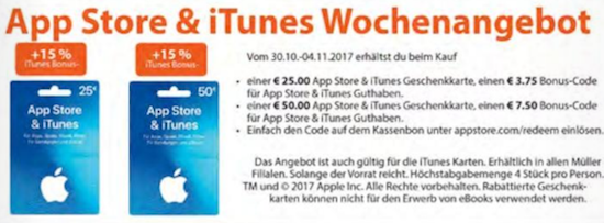 Zu Beginn der neuen Woche gibt es wieder mal ein interessantes Angebot für alle Schnäppchenjäger: Es gibt wieder vergünstigte iTunes-Geschenkkarten. So sind es dieses Mal die Filialen der Drogeriemarktkette Müller, die die Karten zum Sonderpreis verkaufen. Dabei erhält man in dieser Woche ein Bonusguthaben in Höhe von 15% als Guthabencode auf dem Kassenbon beim Kauf der Karten im Wert von € 25,- und € 50,-. Aber Achtung: Die Aktion gilt nur bis Samstag, den 04. November 2017, bzw. solange der Vorrat reicht. Die Anzahl der Karten pro Kauf ist anscheinend nicht begrenzt. Man sollte also im Zweifel schnell sein, um noch rechtzeitig zuschlagen zu können. Schließlich haben die Karten ja kein Verfallsdatum. Der aufgedruckte Wert der Karten und das Zusatz-Guthaben können sowohl für Musik, als auch für Fernsehserien, Filme und Einkäufe im Mac- und iOS-AppStore genutzt werden. (mit Dank an ale Tippgeber!)