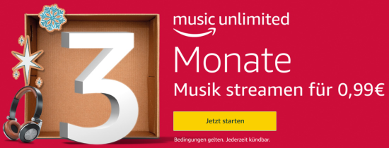 Bei Amazon läuft derzeit bekanntermaßen der Countdown zur Cyber Monday Woche mit jeder Menge vergünstigten Produkten. Parallel dazu hat der Versandhändler noch eine weitere Aktion für seinen Streamingdienst Amazon Music Unlimited aufgelegt, bei der man nicht nur sparen, sondern auch gleich noch satte € 10.000,- gewinnen kann. Hat man den Dienst bislang noch nicht genutzt, kann man ihn aktuell für einmalige € 0,99 drei Monate lang auf Herz und Nieren testen. Enthalten ist dabei natürlich der Zugriff auf den kompletten Katalog mit über 40 Millionen Songs. Das Probe-Abo ist jederzeit kündbar und kann über den folgenden Link bei Amazon gebucht werden: Amazon Music Unlimited Probe-Abonnement
