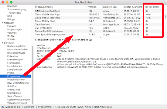 Dort navigiert man dann in der linken Spalte runter in den Bereich "Software" und wählt dort den Menüpunkt "Programme" aus. Im Hauptfenster rechts erscheint daraufhin eine Liste der auf dem Mac installierten Programme, in der zudem auch eine Spalte existiert, in der die Frage, ob es sich um eine 64 Bit App handelt mit "Ja" oder "Nein" beantwortet wird.