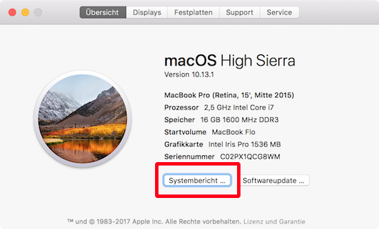 Auch am Mac gibt es eine entsprechende Aufstellung, die man erhält, wenn man sich über das Apfel-Menü oben links in der Menüleiste in "Über diesen Mac" und dort dann in den "Systembericht" begibt.