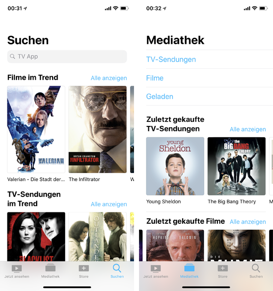 Passend zu den vorhin veröffentlichten guten und günstigen Filmen, die sich derzeit im iTunes Store erwerben lassen, steht inzwischen auch die von Apple angekündigte Version der TV-App auf den deutschen iPhones, iPads und Apple TVs bereit (mit Dank an alle Tippgeber!). Auf den iOS-Geräten wurde dabei vollkommen automatisch die bisherige Videos-App durch die neue TV-App ersetzt. Ab sofort werden dort also nun nicht nur die über den iTunes Store verfügbaren Filme und TV-Serien verwaltet, sondern auch die Inhalte von kompatiblen Apps, wie beispielsweise Amazon Prime Video, Sky Ticket, TV Now Plus oder ZDF-Mediathek. Das Angebot an Inhalten solcher Apps soll nach und nach weiter ausgebaut werden.