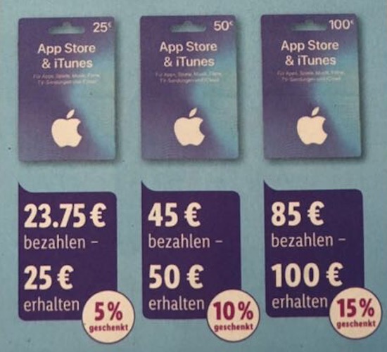 Achtung: Leider kann ich die Hinweise auf die günstigen iTunes-Karten nicht in jedem einzelnen Fall überprüfen. Checkt daher bitte vorher noch einmal ab, ob die jeweilige Filliale den Rabatt auch tatsächlich gewährt!