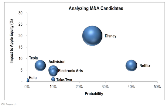 Allerdings ging es in der Videostudie nicht ausschließlich um den Videomarkt, sondern generell um die Frage, welches Unternehmen Apple mit seinen gewaltigen Barreserven übernehmen könnte. Demnach sei Netflix momentan das für Apple attraktivste Übernahmeziel und liegt damit vor anderen interessanten Unternehmen, wie Disney, Electronic Arts oder auch dem Elektroauto-Pionier Tesla. Die Wahrscheinlichkeit einer Netflix-Übernahme wird dabei mit 40% beziffert und somit als am höchsten eingestuft.