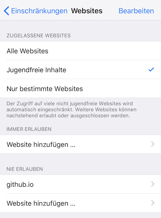 Wer sich vorab vor dem Link schützen möchte, kann die Github-Domain in den Einschränkungen auf seinem Gerät blockieren. Dies geschieht in den Einstellungen unter "Allgemein > Einschränkungen > Websites > Jugendfreie Inhalte > Website hinzufügen". Hier trägt man "github.io" in der Liste "Nie erlauben" ein.