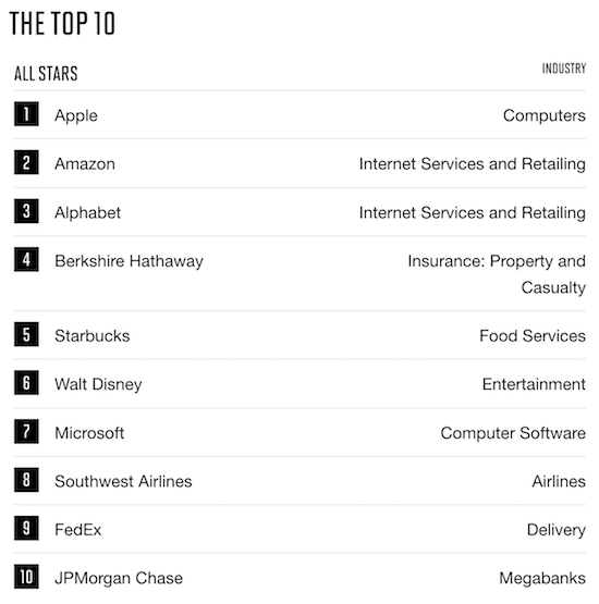 Weitere namhafte Kandidaten auf der 50 Unternehmen umfassenden Liste sind Microsoft auf Platz 7, Facebook auf Platz 12, Coca-Cola auf Platz 18 oder McDonald's auf Position 37. Mit Adidas und Lockheed Martin haben es zudem zwei bekannte Unternehmen erstmals auf die Fortune-Liste geschafft, während GE vom 7. auf den 30. Platz abstürzte.