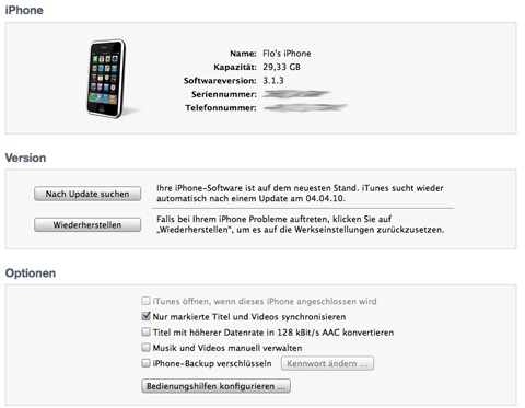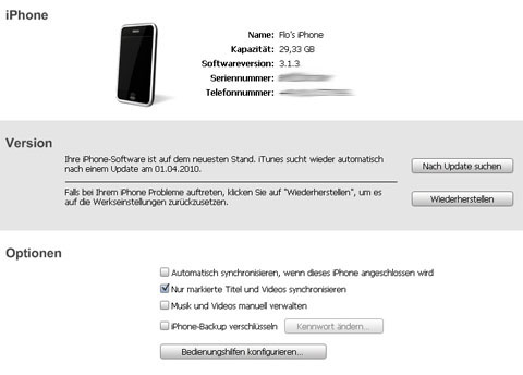 Kleinere Veränderungen gibt es außerdem auch bei den Übersichtsseiten der angeschlossenen Geräte. In der Leiste mit den zu synchronisierenden Inhalten weist nun einen dedizierten Reiter für "Bücher" auf. Mit ein bisschen Glück könnten hierüber demnächst auch E-Books mit dem iPhone und dem iPod touch synchronisiert werden, vorausgesetzt, Apple veröffentlicht die iBooks App auch für diese beiden Geräte. Auch die Übersichtsseite zu den Geräten wurde leicht überarbeitet, wie an den beiden folgenden Screenshots zu sehen ist: