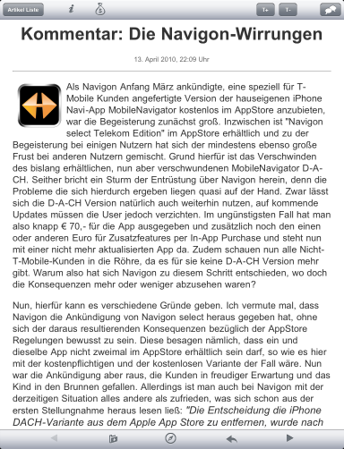 kann kostenlos per Update oder als Neuerwerbung geladen werden. Für alle iPhone und iPod touch Nutzer der App ändert sich durch dieses Update, abgesehen von kleineren Codeverbesserungen, nichts. Dafür wird aus der App nun eine sogenannte "Universal App", also eine App, die sowohl auf dem iPhone und iPod touch auf der einen, als auch auf dem iPad auf der anderen Seite ein eigenes User Interface besitzt (im AppStore an einem kleinen Plus-Zeichen zu erkennen). Wie Apple ankündigte, würde prinzipiell auch die reine iPhone-Version meiner App auf dem iPad laufen. Nach einem Test im iPad-Simulator habe ich mich jedoch dazu entschlossen, ein eigenes User Interface hierfür zu erstellen. Screenshots dazu gibt es weiter unten. An dieser Stelle möchte ich all diejenigen, die bereits im Besitz eines iPads sind dazu aufrufen, mir