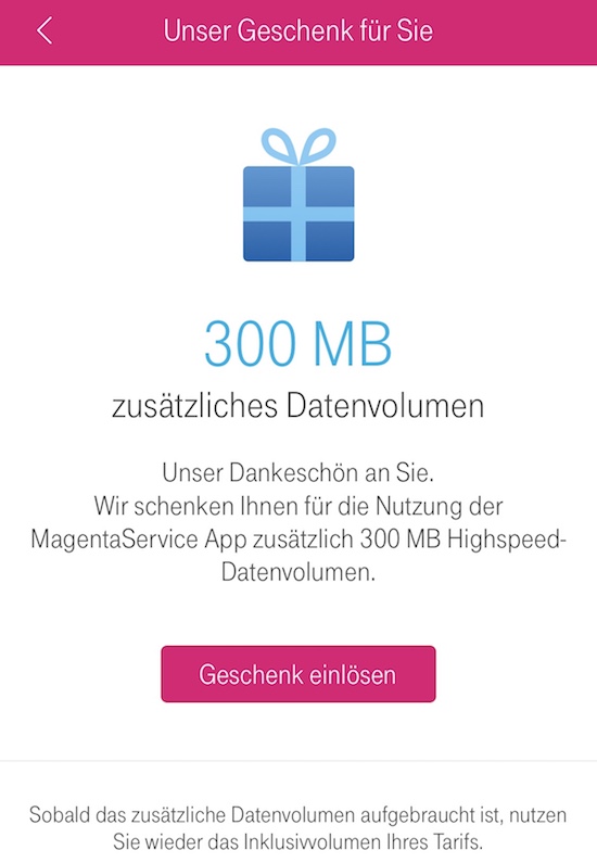 Der April beginnt erneut erfreulich für alle Mobilfunkkunden bei der Telekom. Diesen schenkt der Magenta-Konzern, wie auch schon im vergangenen Monat, erneut ein zusätzliches Datenvolumen in Höhe von 300 MB. Dies ist zwar nicht weltbewegend, aber eben dennoch eine nette Geste, die man sicherlich gerne annimmt. Um das Geschenk in Anspruch nehmen zu können, reicht es aus, die MagentaSERVICE-App (kostenlos im AppStore) zu öffnen und direkt auf dem Startbildschirm den entsprechenden Button zu betätigen. Ist dies geschehen, werden zunächst die geschenkten 300 MB verbraucht, ehe die Telekom wieder auf das im Vertrag verbliebene Volumen umschaltet.