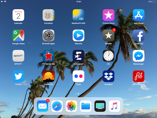 Immer wieder erreichen mich Zuschriften von Lesern, die gerne einmal wissen würden, wie es denn wohl auf den Homescreens meiner iOS-Geräte aussieht. In der Vergangenheit hatte ich hierzu immer mal wieder einen kleinen Artikel verfasst, der diese Homescreens zeigt und die darauf installierten Apps kurz vorstellt. Nun ist das Jahr 2018 da und die angesprochenen Zuschriften häufen sich mal wieder ein wenig. Bereits vor ein paar Wochen hatte ich daher schon einen Artikel zu den ersten beiden Screens meines iPhone X veröffentlicht, nun soll ein weiterer zu meinem iPad-Homescreen folgen. Auffallend ist auch hier für mich jedes Mal wieder, wie selten ich Apps von der ersten Seite meines iPad verbanne. Die meisten Apps die sich dort befinden, haben diesen Platz schon eine gefühlte Ewigkeit gebucht und sind auch nur entsprechend schwer dort zu verdrängen, was zum einen sicherlich einer gewissen Gewöhnung geschuldet ist, andererseits aber auch ein Stück weit die Relevanz und Nutzungshäufigkeit widerspiegelt. Aber genug der langen Vorrede - hier ist also mein aktueller Homescreen auf meinem 9,7"-iPad.