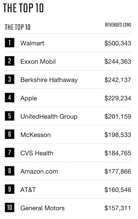 In den vergangenen beiden Jahren belegte Apple stets den dritten Platz in den jährlich herasgegebenen Fortune 500. In diesem Jahr musste man nun einen Platz einbüßen und kommt hinter Walmart, Exxon Mobil und Berkshire Hathaway auf dem vierten Platz ins Ziel. Huaptgrund hierfür ist der Aufstieg des Öl-Multis Exxon Mobil vom 4. Platz im vergangenen Jahr auf den 2. Platz in der aktuellen Liste. Die Top 5 komplettiert die UnitedHealth Group. Als weitere Technologie-Konzerne listet Fortune Amazon auf Rang 8, AT&T direkt dahinter auf Rang 9, Verizon auf der 16, die Google-Muuter Alphabet auf Platz 22 und Microsoft an Position 30.
