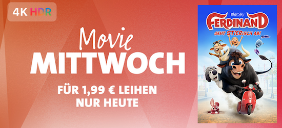 Auch heute hat Apple wieder den sogenannten "Movie Mittwoch" ausgerufen. Dabei wird jeden Mittwoch ein ausgewählter Film aus dem iTunes-Sortiment für 24 Stunden zum Sonderpreis von nur € 1,99 in 4K HDR Qualität zum Leihen angeboten. Heute erhält man dabei den aberwitzigen Animationsfilm Ferdinand - Geht STIERisch ab um einen abenteurlustigen Stier. Nachdem man den Leih-Film geladen hat, kann er innerhalb von 30 Tagen angeschauen werden. Wie immer bei geliehenen Filmen aus dem iTunes Store gilt: Hat man hiermit einmal begonnen, muss man ihn innerhalb von 48 Stunden beenden.