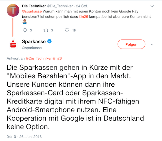 Dass Apple größtes Interesse daran haben dürfte, Apple Pay nach Deutschland, als einen seiner wichtigsten Märkte zu bringen, dürfte klar sein. Und auch die Sparkassen haben nun ein "grundsätzliches Interesse an Apple Pay" signalisiert. Auf der Android-Plattform werde man in Kürze mit einer eigenen "Mobiles Bezahlen"-App an den Start gehen, wie man nun per Twitter verlauten ließ - wohlgemerkt auf der Android-Plattform.