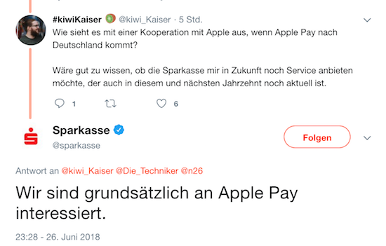 In einem weiteren Tweet schüren die Sparkassen nun aber auch Hoffnung, dass man demnächst auch mit einem iPhone bzw. einer Apple Watch wird bargeldlos bezahlen können.