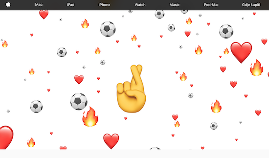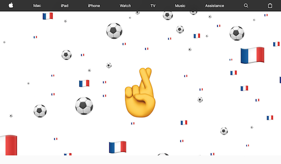 Am morgigen Sonntag findet, wie inzwischen alle wissen ohne deutsche Beteiligung, das Endspiel der diesjährigen Fußball-Weltmeisterschaft in Russland statt. Apple hat dies zum Anlass genommen, um seine Webseiten in den beiden Final-Ländern Frankreich und Kroatien zu aktualisieren und auf der Startseite ein jeweils landesspezifisches 3-sekündiges Video mit Fußballbezug zu posten. In Frankreich fliegen dabei Fußbälle und die französische Flagge wild durch die Gegend, in Koratien sind es Fußbälle, Feuer- und Herz-Emojis. Nachdem das Video einmal gelaufen ist, präsentiert sich die Webseite wieder im ganz normalen Look. Nun denn, möge der Bessere gewinnen!