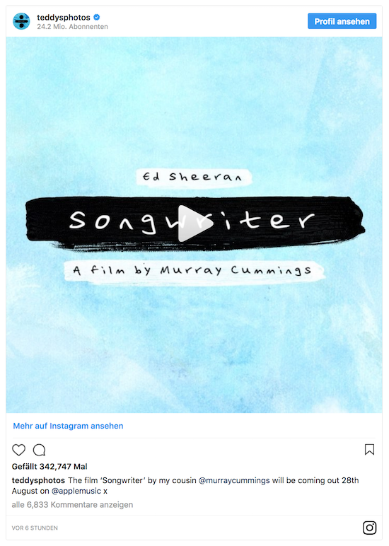 Bereits vor einigen Monaten hatte Apple einen weiteren exklusiven Inhalt für seine Apple Music Abonnenten an Land gezogen. Dabei handelt es sich um die Rechte an der Ed Sheeran Dokumentation "Songwriter". Nun steht auch der Termin der Verfügbarkeit fest. So hat Sheeran höchst selbst auf seinem Instagram-Account verkündet, dass die Dokumentation ab dem 28. August exklusiv auf Apple Music verfügbar sein wird. Inhaltlich geht es dabei vor allem um den Entstehungsprozess von Sheerans drittem und aktuellen Album ÷.