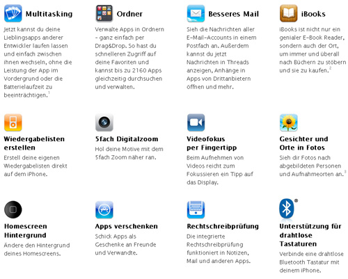 Mit Ausnahme der iPhone 4 spezifischen Funktionen, wie z.B. FaceTime, erhalten das iPhone 3G[s], sowie der iPod touch 3G (64 GB und 32 GB Version) den kompletten Funktionsumfang von iOS 4 inkl. Multitasking, Ordner, Hintergrundbilder, Unified Mailbox, usw. Beim iPhone 3G und iPod touch G2 (inkl. des iPod touch 8 GB aus dem Jahr 2009) müssen Abstriche gemacht werden. So wird auf dieser Hardware kein Multitasking, keine Hintergrundbilder und keine Unterstützung für Bluetooth-Tastaturen angeboten.