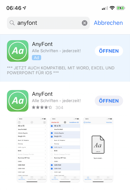 Im vergangenen Monat hatte Apple bereits angekündigt, dass man seine Search Ads ab dem 01. August unter anderem auch nach Deutschland bringen wird. Bislang standen die Search Ads bereits in den USA, Australien, Kanada, Mexiko, Neuseeland, Großbritannien und der Schweiz zur Verfügung, neben Deutschland kommen seit gestern auch Frankreich, Italien, Japan, Südkorea und Spanien hinzu, was die Anzahl der Länder auf 13 bringt. Nun ist es soweit und die ersten Werbeeinblendungen tauchen im deutschen AppStore auf, wie im Beispiel unten für meine App AnyFont (€ 2,29 im AppStore) zu sehen.