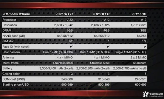 Die beiden neuen OLED-iPhones in den Varianten mit 5,8"- und 6,5"-Display sollen wie erwartet bereits im September erhältlich sein (vermutlich ab dem 21. September, bei einem Vorbestellstart am 14. September), das ebenfalls erwartete 6,1"-Modell jedoch aufgrund von Produktionsschwierigkeiten erst später. Sowohl das 6,1"-, als auch das 6,5"-Modell sollen als Single- und als Dual-SIM Versionen auf den Markt kommen, wobei letztere nur in bestimmten Märkten erhältlich sein sollen. Damit stimmt Kuo in diesem Punkt mit Bloomberg überein, die ähnlich berichtet hatten. 5,8"-Modell soll keine Dual-SIM Version erhalten, allerdings könnte neben dem herkömmtlichen SIM-Kartenslot hier eine e-SIM integriert sein. Kuo ist sich aber nicht sicher, ob diese auch aktiviert und damit nutzbar sein wird. (via MacRumors)