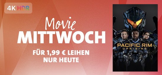 Auch heute hat Apple wieder den sogenannten "Movie Mittwoch" ausgerufen. Dabei wird jeden Mittwoch ein ausgewählter Film aus dem iTunes-Sortiment für 24 Stunden zum Sonderpreis von nur € 1,99 in 4K-HDR-Qualität zum Leihen angeboten. Heute erhält man dabei den Action-Kracher Pacific Rim: Uprising. Nachdem man den Leih-Film geladen hat, kann er innerhalb von 30 Tagen angeschauen werden. Wie immer bei geliehenen Filmen aus dem iTunes Store gilt: Hat man hiermit einmal begonnen, muss man ihn innerhalb von 48 Stunden beenden.