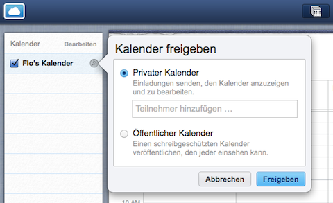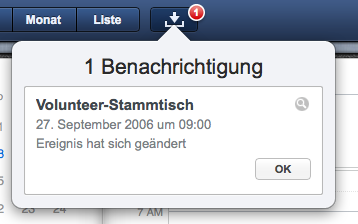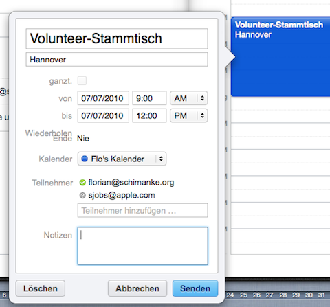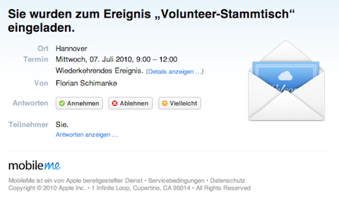 endlich mit anderen Nutzern teilen oder für eine Gruppe oder ein Team freigeben zu können. Erledigt wird dies über den von Dateien auf der iDisk bekannten Share-Button. Klickt man ihn an, kann man den Kalender entweder als "Privaten Kalender" deklarieren und damit nur für bestimmte Personen freigeben, oder als "Öffentlichen Kalender", wodurch er für jedermann einsehbar, aber schreibgeschützt ist. Ebenfalls neu ist die Möglichkeit, Einladungen zu Terminen und Ereignissen an beliebige Adressaten zu versenden. Hierzu gibt man beim jewiligen Termin schlicht die E-Mail Adresse des Teilnehmers ein und speichert ihn. Der Empfänger kann den Termin