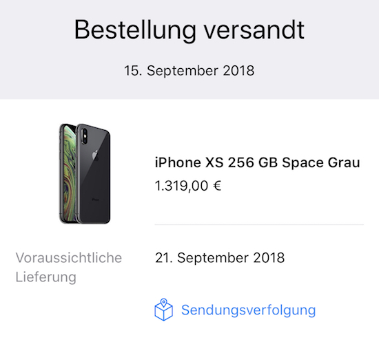 Wenig überraschend hat Apple am heutigen Tage und damit genau einen Tag vor dem offiziellen Verkaufsstart von iPhone XS, iPhone XS Max und Apple Watch Series 4 damit begonnen, die vorbestellten Geräte an ihre neuen Besitzer zu versenden, damit diese auch garantiert rechtzeitig morgen bei ihnen aufschlagen. Aktuell ist mit bekannt, dass die Geräte per UPS und DHL ausgeliefert werden. Entsprechende Tracking-Links können der Versandmitteilung Apples aus der Apple Store App oder der Webversion entnommen werden. Hierüber kann man sich informieren, wann das Paket in etwa zugestellt wird, damit man zu diesem Zeitpunkt auch wirklich anwesend ist. Die Kuriere sind wie immer angewiesen, die Lieferung ausschließlich an den Adressaten persönlich zu übergeben. Offenbar befinden sich die neuen iPhones und Apple Watches bereits in Deutschland, so dass einer pünktlichen Zustellung nichts im Wege stehen dürfte.