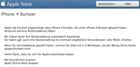 Wie vergangene Woche von Steve Jobs auf der Pressekonferenz zu den iPhone 4 Empfangsproblemen angekündigt, hat Apple heute damit begonnen, den Preis für bereits über den Apple Online Store getätige Bumper-Käufe zurück zu erstatten. In der Rückerstattung enthalten sind auch die eventuell angefallenen Versandkosten. Entsprechende E-Mails werden seit wenigen Stunden an betroffene Käufer verschickt. Für den Fall, dass der Kauf mit einer Kreditkarte durchgeführt wurde, sind mit 3-5 Werktagen zu rechnen, bis