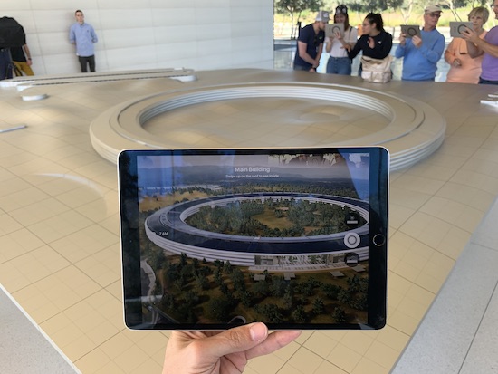 Eine Sondererwähnung hat sich auch das Modell des gesamten Geländes des Apple Park verdient. Dieses präsentiert sich zunächst einmal recht unscheinbar als schliche, einfarbige Alu-Konstruktion. Der Clou ist jedoch, dass sich das Modell per Augmented Reality erkunden lässt. Hierzu stehen direkt ein paar mit iPads bewaffnete Apple-Mitarbeiter parat, die einem das Gerät in die Hand drücken und zum virtuellen Rundgang einladen. Und siehe da, richtet man die iPad-Kamera auf das Modell, erscheint auf dem Display der Apple Park in seiner ganzen Pracht. Per Pinch- und Zoom-Gesten kann man sogar näher hinschauen und mit einem einfachen Swipe nach oben sogar die Dächer der Gebäude lüften, um einen Blick ins Innere zu werfen. Eine wirklich beeindruckende Demonstration der Möglichkeiten von Augmented Reality!