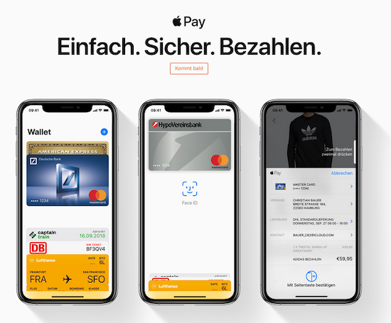 Nach wie vor warten wir auf den offiziellen Start von Apple Pay in Deutschland, der nach offiziellen Aussagen noch in diesem Jahr erfolgen soll. Nun ist immerhin ein weiteres Etappenziel erreicht. Seit heute verschicken nicht nur verschiedene deutsche Banken, darunter die HVB oder Bunq E-Mails an seine Kunden (danke an alle Tippgeber!), in denen sie die Unterstützung des in Kürze startenden Bezahldienstes in Deutschland ankündigen, auch Apple hat nun erstmals die deutsche Apple Pay Webseite scharfgeschaltet. Dort findet man aktuell zwar noch den Zusatz "Kommt bald", dennoch bedeutet dies, dass der Start von Apple Pay von Deutschland nach Monaten und Jahren des Wartens nun in der Tat unmittelbar bevorsteht.