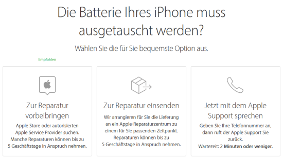 Möchte man einen Termin für den Akkutausch vereinbaren, ruft man einfach die zugehörige Apple-Supportseite auf, wählt dort die gewünschte Option, meldet sich mit seiner Apple ID an und vereinbart entweder einen Termin in einem Apple Store in der Nähe oder eine Einsendung des Geräts für den Akkutausch. Entscheidet man sich für die Reparatur in einem Store, bringt man sein Gerät einfach zum vereinbarten Termin dort vorbei. In der Regel haben die Stores genügend Ersatzakkus vor Ort, so dass der Tausch in der Regel nicht länger als drei Stunden dauern sollte. Dies ist demnach dann auch die deutlich komfortablere und schnellere Variante gegenüber dem Einsenden des Geräts.