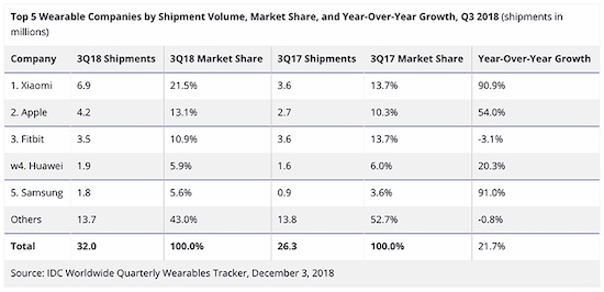 Insgesamt konnte auch der Wearables-Markt als Ganzes wachsen und letzte um 21,7% auf 32 Millionen Geräte im dritten Quartal 2018 zu.